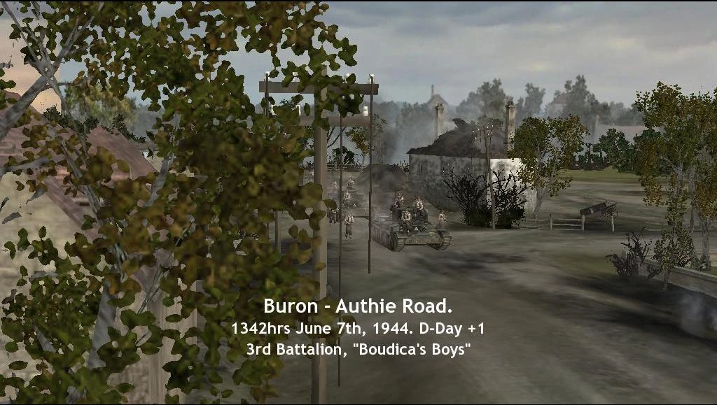 Soldiers atop a Cromwell Tank column discuss one of Major Blackmore's daring achievements until they are ambushed by Grenadiers and a Panther tank. After quickly eliminating the threat, Corporal Degnan is assigned to prepare defenses and eliminate the Panzer counterattack. Once the attack is over, 3rd Battalion barrages the town and moves in to capture Authie.