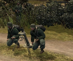The GrW 34 8cm Mortar Team provides effective fire support on the battlefield. A high angle can hit targets behind objects, and a good rate of fire can saturate the area.