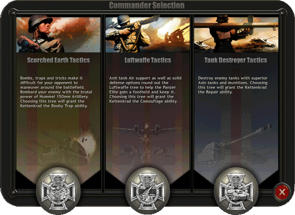 The Tank Destroyer Tactics Command Tree, unlike the other two, is meant to capitalize on the Panzer Elite's greatest strength: offensive firepower. It augments the Panzer Elite's strongest units, and adds two even stronger units to make a powerful assault force. It generally aims to win the game during the later stages of the battle, and usually requires the Panzer Elite company to survive longer - with greater benefits in the later game.